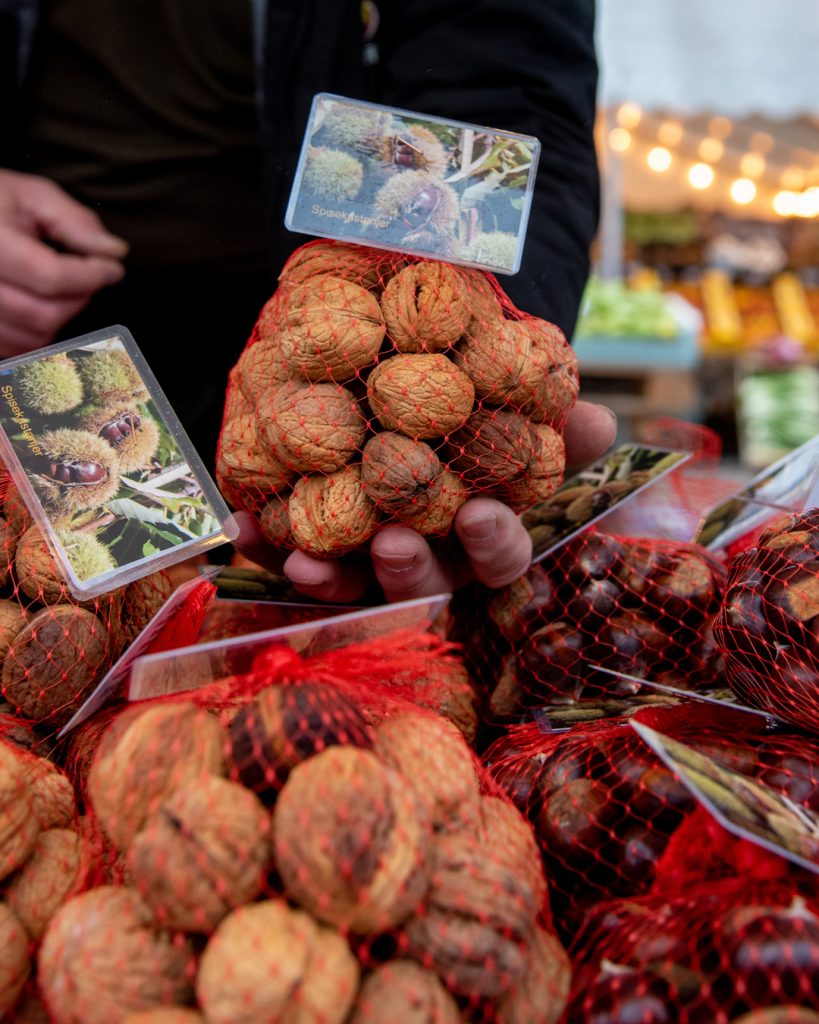 Men Knud har mere end kastanjer med på torvet. Du kan også få fingrene i valnødder af egen avl, som i år er ekstra fine takket være den varme sommer, samt hasselnødder af sorten Lamberts Filbert fra Lars Westergaards økologiske nøddeplantage i Kerteminde.